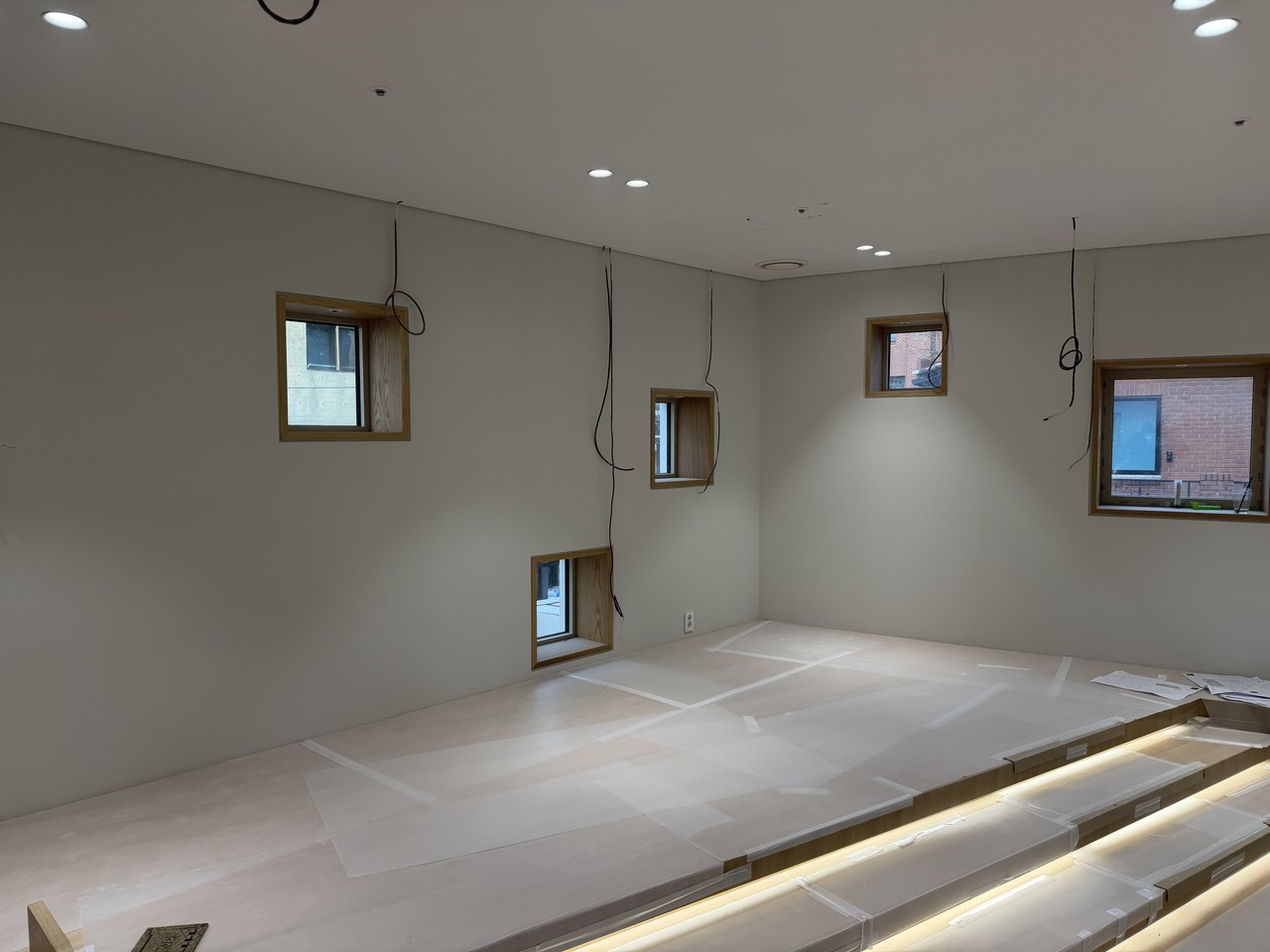 서초동에 위치한 교회 내부의 키즈시설과 카페 인테리어 시공현장입니다. 남녀노소 많은 사람들이 방문하는 공간인 만큼 전체적으로 아늑하고 따듯한 분위기가 느껴지는 인테리어로, 대부분의 공정이 마무리 되어가는 모습입니다. 천정과 도장, 조명 작업까지 완료되어 제작가구들도 배치되면 전체적인 공간의 모습이 완성될 예정입니다.