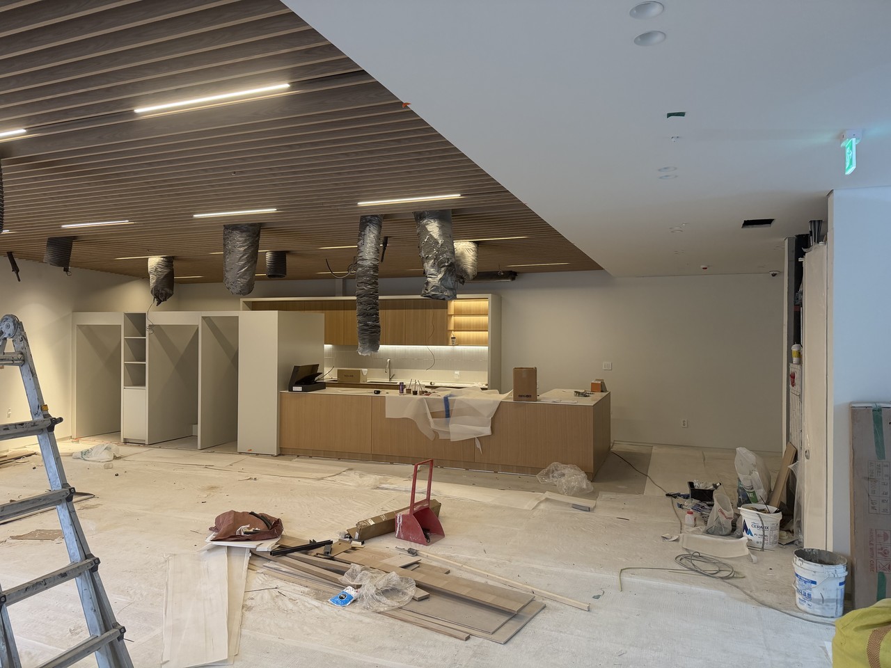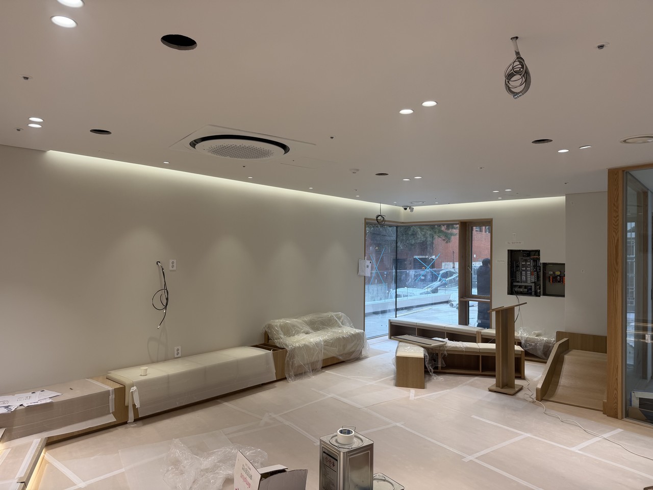 공용라운지는 작은 소음정도에서는 자유로운 공간이기 때문에 최대한 차단할 수 있는 방음문을 설치합니다. 기존 유지되는 공간들은 최대한 보호하기 위해 보양작업을 철저하게하고, 라운지라는 공간에 맞는 조명이 재시공되어야 하기 때문에 설비와 전기 작업 또한 작업하여 새로운 공간이 될 예정입니다.